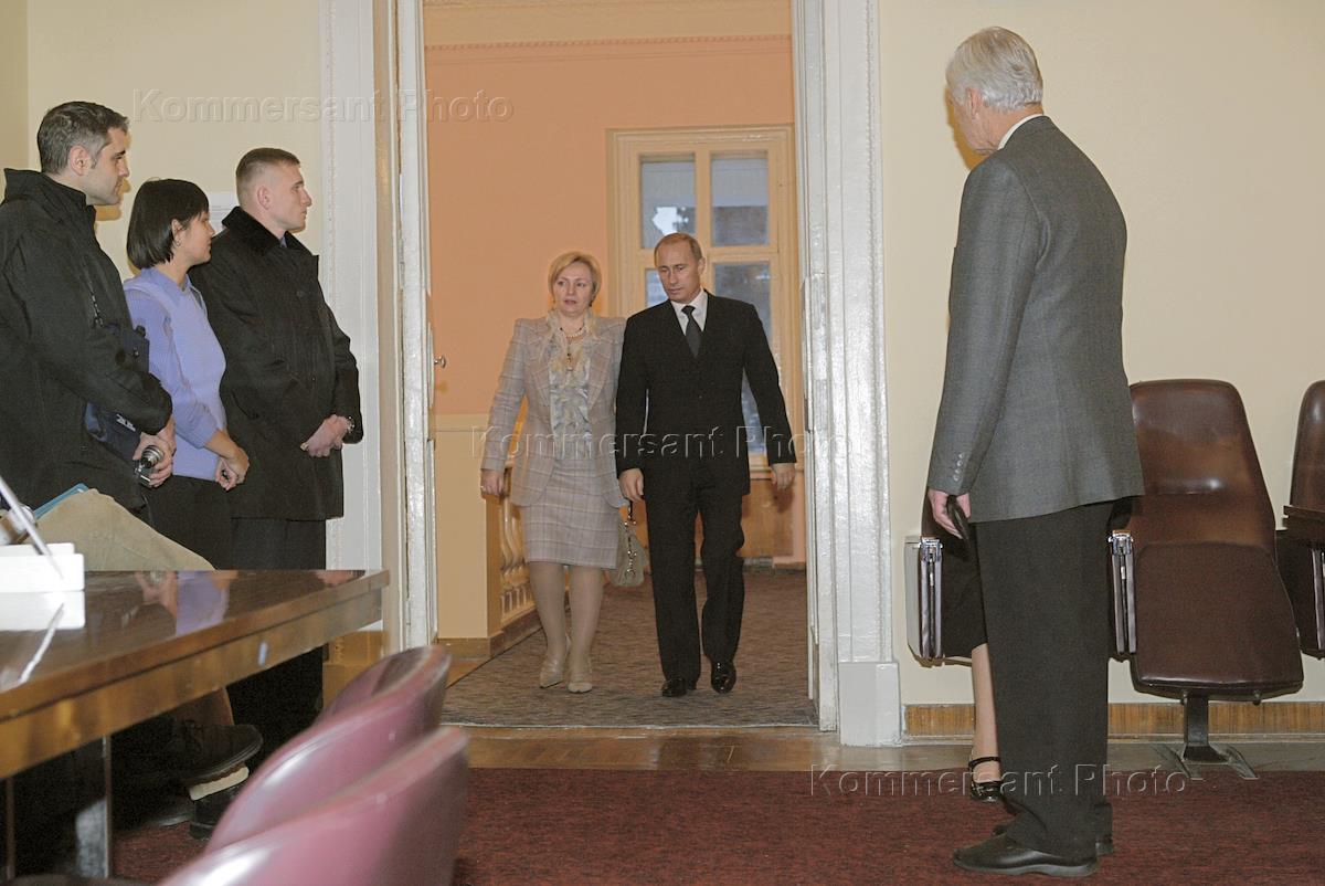 Russian President Vladimir Putin and his wife Ludmila Putina (centre) enter the polling station number 2039 to cast their votes in the parliamentary election.