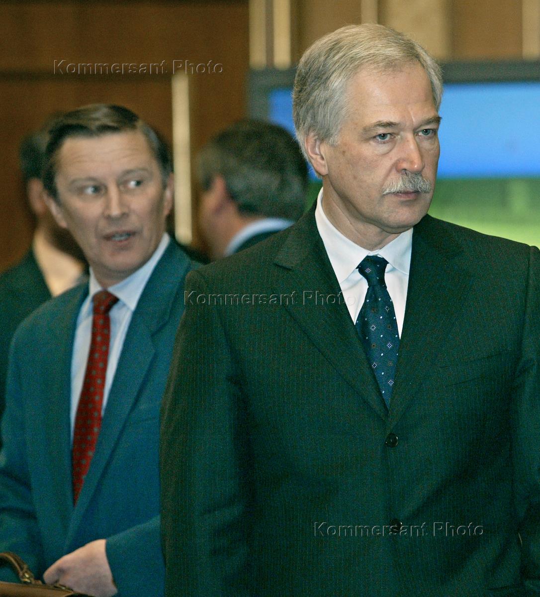 Russian Defence Minister Sergey Ivanov (left) and Interior Affiars Minister Boris Gryzlov (right) arrive at a government meeting.