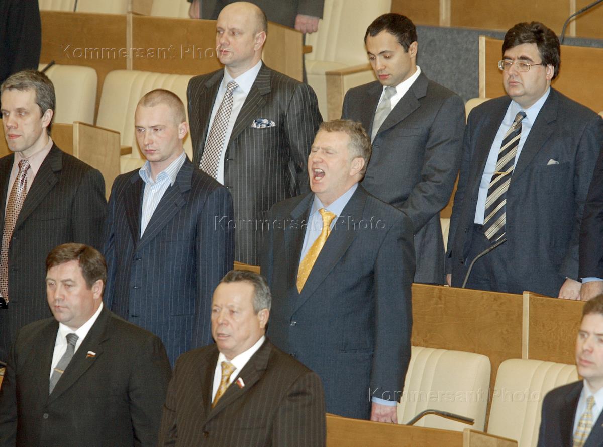 Фракция Либерально-демократической партии России: лидер партии Владимир Жириновский (второй ряд, справа), руководитель фракции ЛДПР Игорь Лебедев (второй ряд, в центре), заместитель руководителя фракции Егор Соломатин (второй ряд, слева) и член Комитета Государственной Думы России по кредитным организациям и финансовым рынкам Алексей Митрофанов (третий ряд, справа) во время последнего заседания Госдумы третьего созыва.