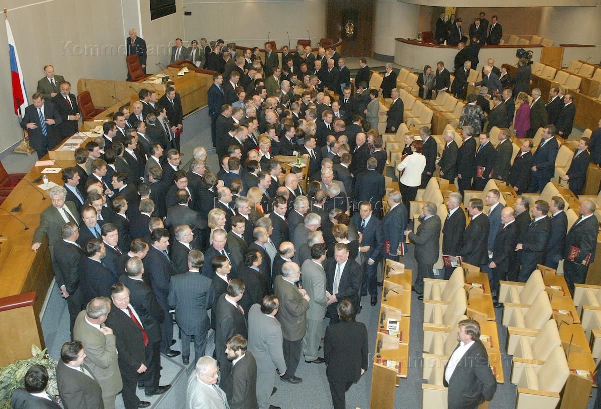 Депутаты Государственной Думы России во время последнего заседания Госдумы третьего созыва. Общий вид зала.