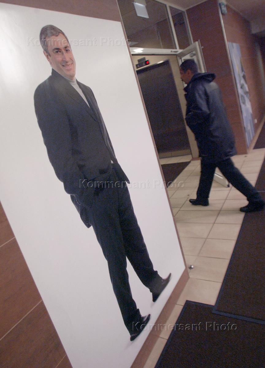 Портрет главы "ЮКОСа" Михаила Ходорковского у входа в центральный офис НК ЮКОС.
