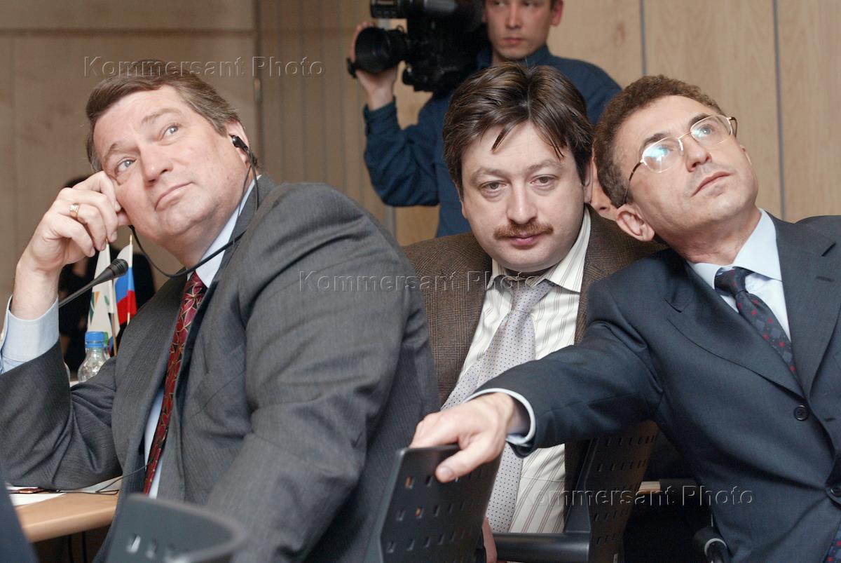 Вице-президент нефтяной компании (НК) "ЮКОС" Стивен Тиди (слева), член совета директоров ОАО"НК ЮКОС" Александр Темерко (в центре) и председатель правления компании "Юкос-Москва" Семен Кукес (справа) на пресс-конференции членов правления НК "ЮКОС", которая стала первым публичным мероприятием компании после объявления о прекращении сделки об объединении с компанией "Сибнефтью". Пресс-конференция прошла в центральном офисе НК "ЮКОС".