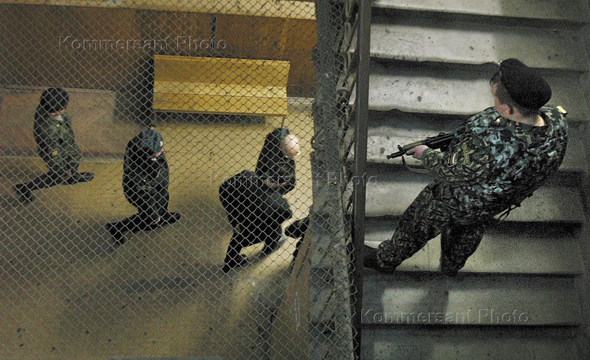 People accused of assassination of the State Duma member Galina Starovoytova in 1998 are led into the St.Petersburg City Court to attend the court session summoned for the first to hearing of the case.