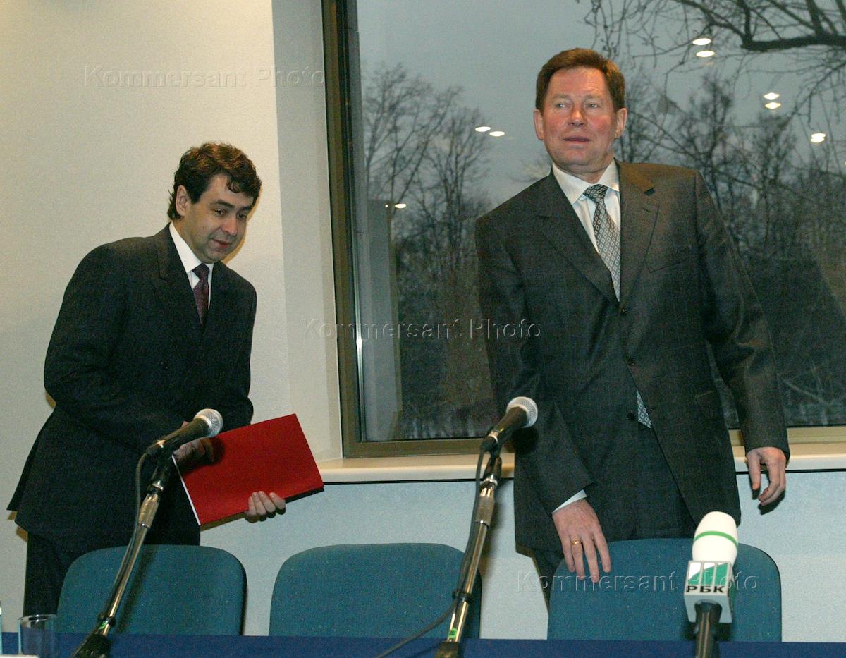 Председатель Федеральной комиссии по рынку ценных бумаг (ФКЦБ) Игорь Костиков (слева) и заместитель председателя Правительства России по жилищно - коммунальному комплексу Владимир Яковлев (справа) на конференции "Развитие ипотечного кредитования в России. Секьюритизация ипотечного рынка". Конференция прошла в Центре международной торговли.