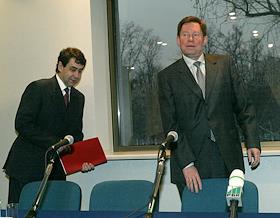 Chairman of the Russian Federal Securities Market Commission (FKCB) Igor Kostikov (left) and Deputy Prime Minister Vladimir Yakovlev (right) take part in the news conference summoned to discuss development of mortgage securities market in Russia. The news conference was held in the World Trade Centre.