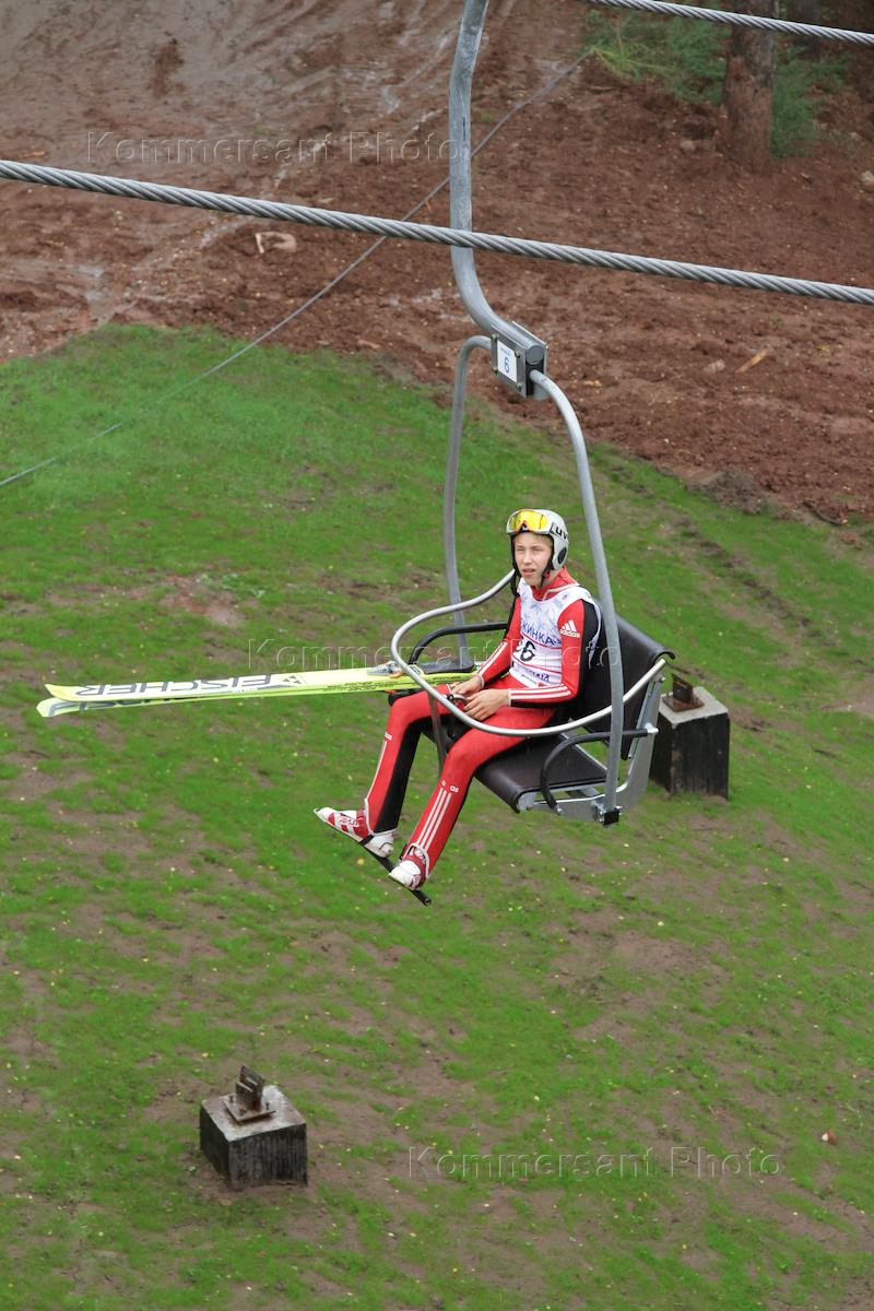 Федеральный центр по подготовке спортсменов к зимним видам спорта. Спортсмен поднимается по канатной дороге на трамплин для прыжков на лыжах.