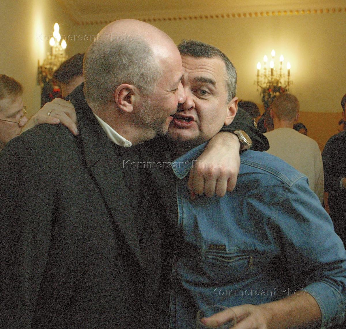 Director general of the Kommersant Publishing House Andrey Vasilyev (left) hugs Kommersant photo correspondent Vasily Shaposhnikov (right) during the corporate party held in the Praga Restaurant to see in the New Year 2004.