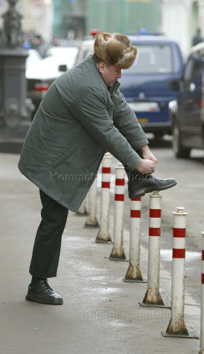 Vice chairman of the State Duma Defence Committee, former chief of the presidential bodyguards Alexander Korzhakov adjusts an unlaced shoe outside the Russian Trade and Commerce Chamber (TPP) headquarters after attending a meeting of the TPP board.