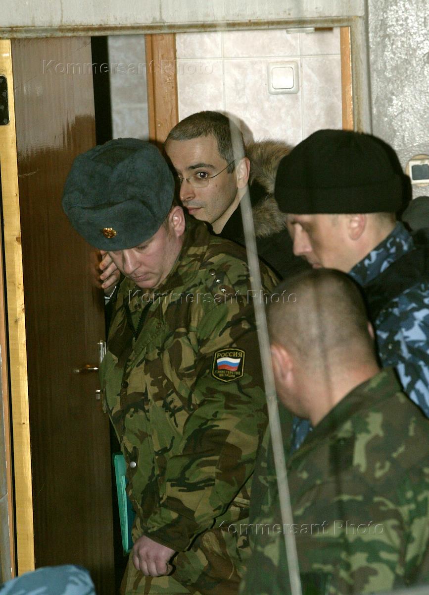 Former CEO and major shareholder of Yukos oil company Mikhail Khodorkovsky is convoyed to the Moscow Basmanny Court. The court prolongated Mr Khodorkovsky's preliminary confinement by three months - to March 25, 2004.
