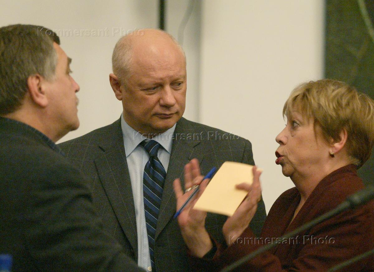 The newly elected rector of the Russian State Humanitarian University (RGGU) Valery Minayev (centre) talks to the unidentified RGGU professors.