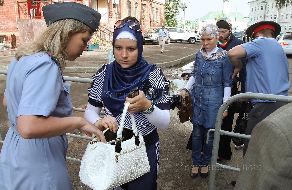 Police officers examine people who came to the Apanayev Mosque in Kazan to attend the farewell ceremony for Valiulla Yakupov, head of the education department of the Muslim Spiritual Directorate of Tatarstan.