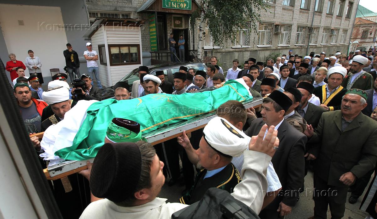 The farewell ceremony for Valiulla Yakupov, head of the education department of the Muslim Spiritual Directorate of Tatarstan, in the yard of the Apanayev Mosque, Kazan.