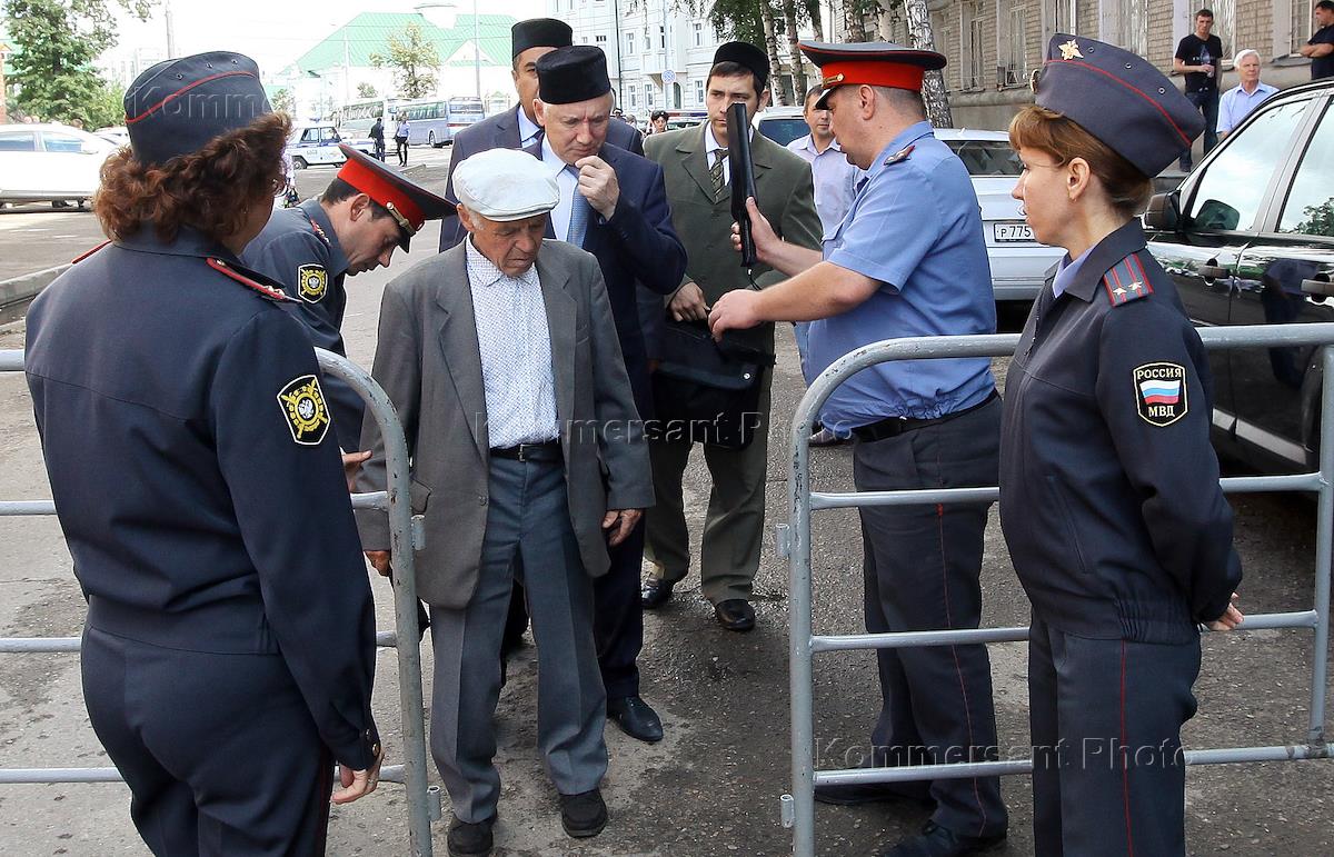 Police officers examine people who came to the Apanayev Mosque in Kazan to attend the farewell ceremony for Valiulla Yakupov, head of the education department of the Muslim Spiritual Directorate of Tatarstan.