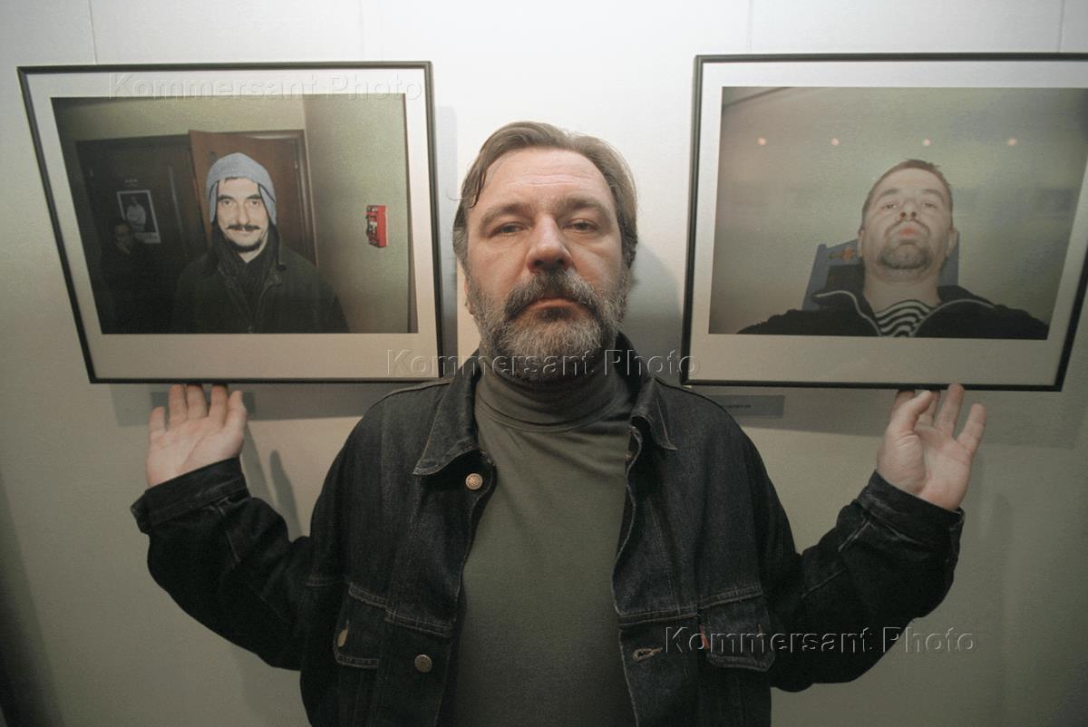 Russian artist Konstantin Batynkov poses for a photo with two of his works displayed in the Sam Brooks Gallery.