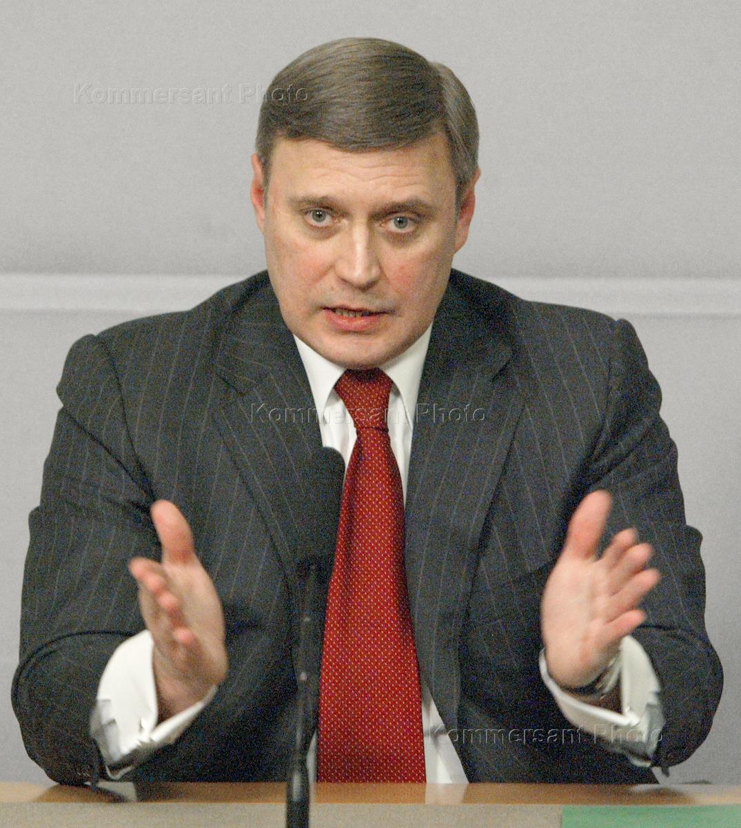 Russian Prime Minister Mikhail Kasyanov speaks at the news conference summoned to announce results of the country's economic development in 2003. The news cofnerence was held in the Russian Cabinet headquarters.