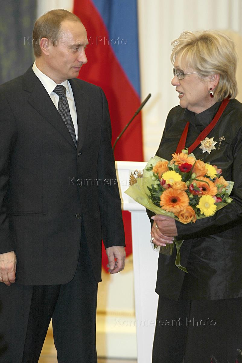 Russian President Vladimir Putin (left) delivers the national achievement award to art director of the Sovremennik Theatre Galina Volchek (right). The national achievment awards ceremony was held in the Kremin Catherine Hall.