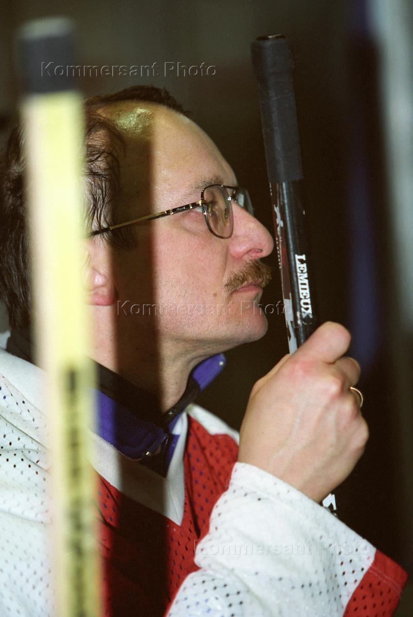 Director general of Interros holing Andrey Klishas (left) attends an ice hockey match played by the Interros top managers on holiday in the French Apls resort of Courchevel.