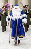 Opening ceremony the Championship of a creating of snow figures "AiF. A snowman - 2004" in the Central recreation park n.a. Gorky. The actor in Father Frost suit with musicians of a military orchestra during ceremony.