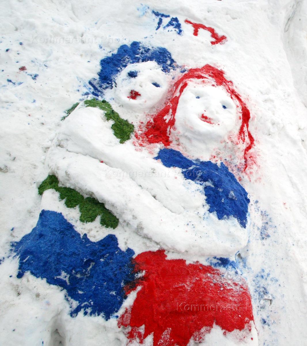 Coloured snow effigies of the Russian pop-duet t.A.T.u. presented in teh Gorky Park during the snow sculpture contest.