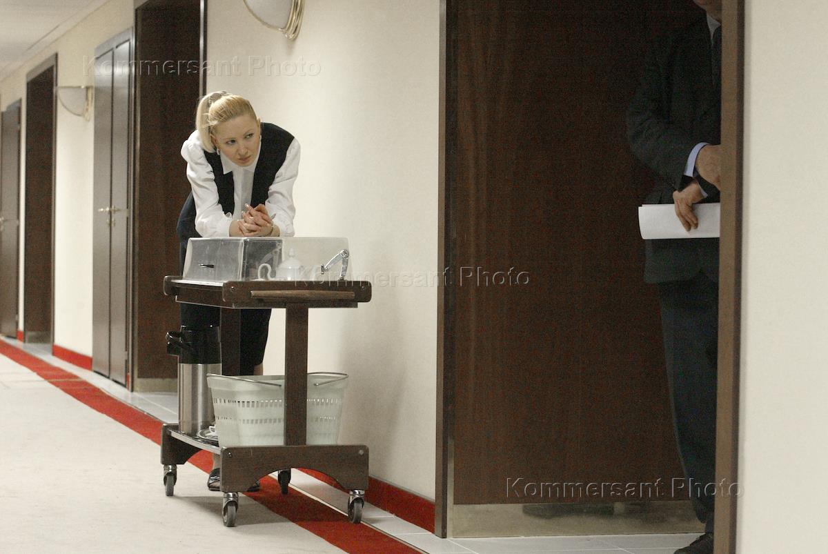 A waitress waits for admission into one of the offices of the Federation Council (upper house of Russian parliament).