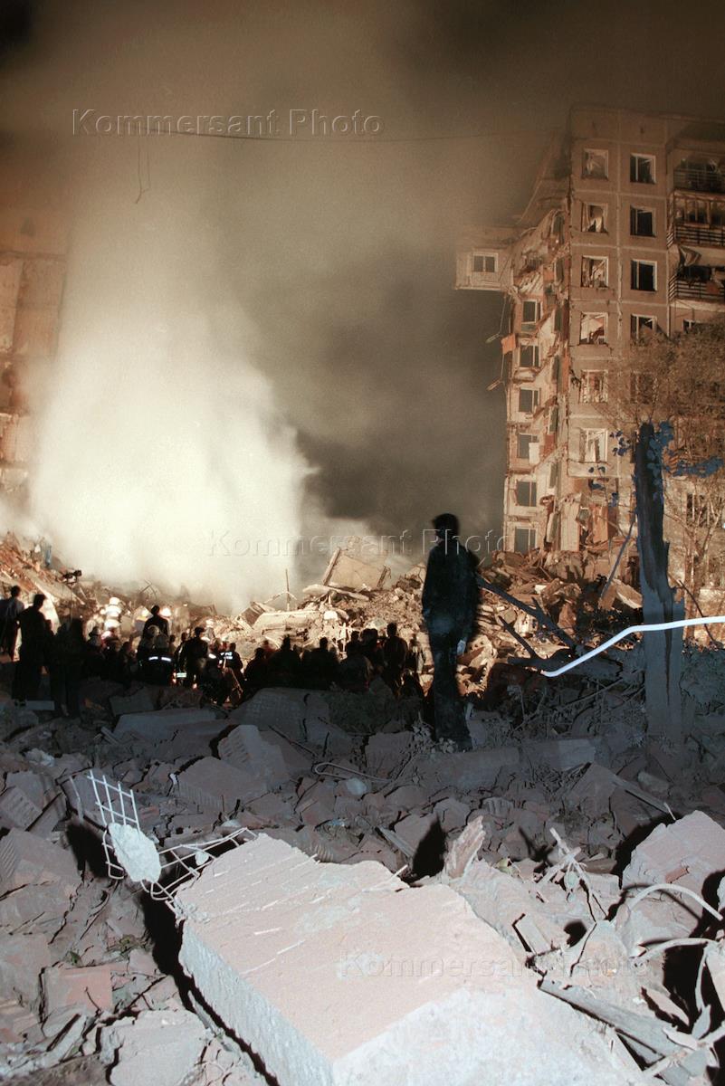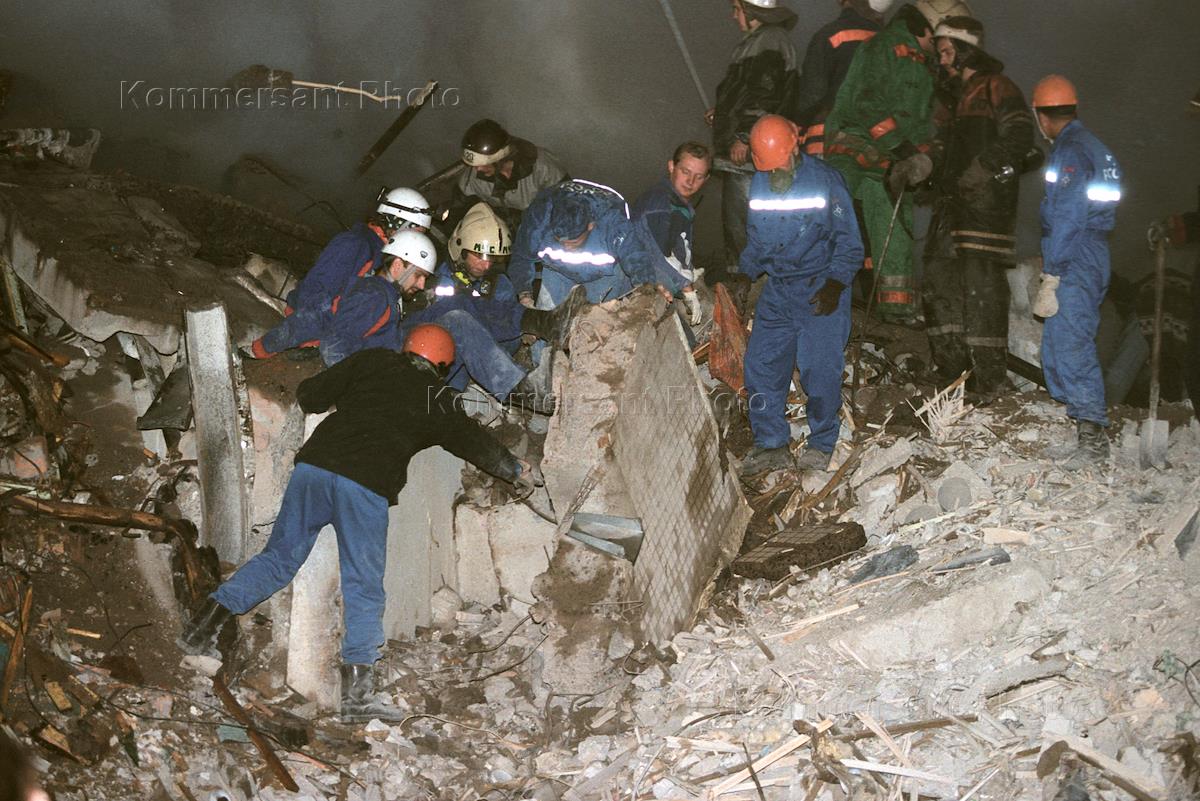 Спасатели министерства по чрезвычайным ситуациям России разбирают завалы на месте двух взорванных террористами подъездов жилого дома № 17 по улице Гурьянова. Согласно официальным данным жертвами этого теракта стали 94 человека.