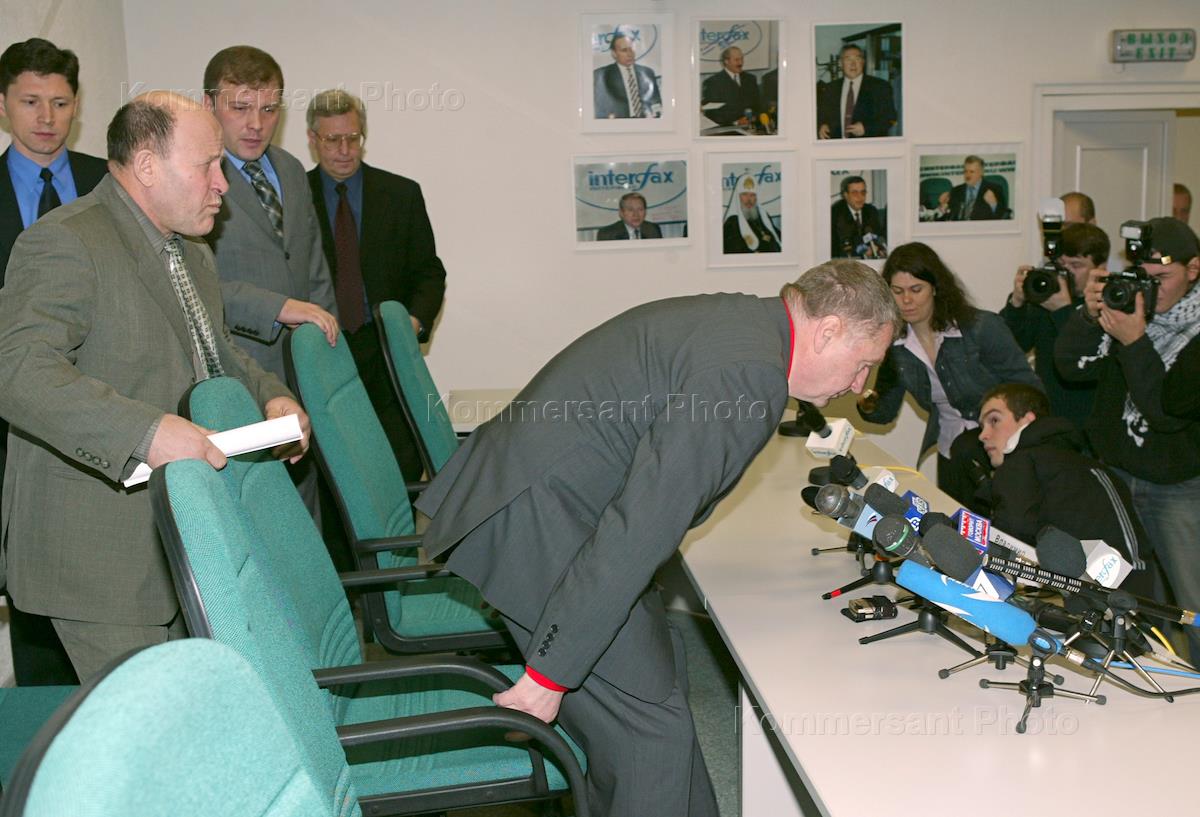 Лидер Либерально-демократической партии России (ЛДПР) Владимир Жириновский (в центре) и кандидат в Президенты России от ЛДПР Олег Малышкин (второй слева) на пресс-конференции на тему: "Представление команды ЛДПР, участвующей в президентских выборах". Пресс-конференция прошла агентстве "Интерфакс".