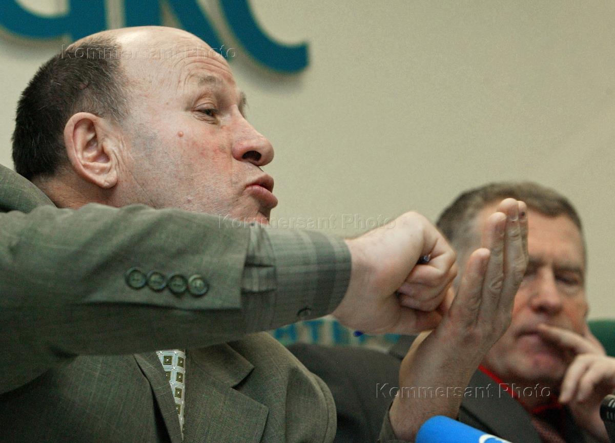 Лидер Либерально-демократической партии России (ЛДПР) Владимир Жириновский (справа) и кандидат в Президенты России от ЛДПР Олег Малышкин (слева) на пресс-конференции на тему: "Представление команды ЛДПР, участвующей в президентских выборах". Пресс-конференция прошла агентстве "Интерфакс".