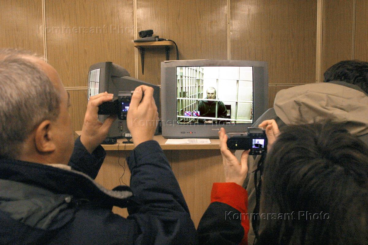 Former CEO and major shareholder of Yukos oil company - Mikhail Khodorkovsky (shown on the television screen) attends the Moscow City Court hearings of his appeal filed to protest against extension of his preliminary confinement.