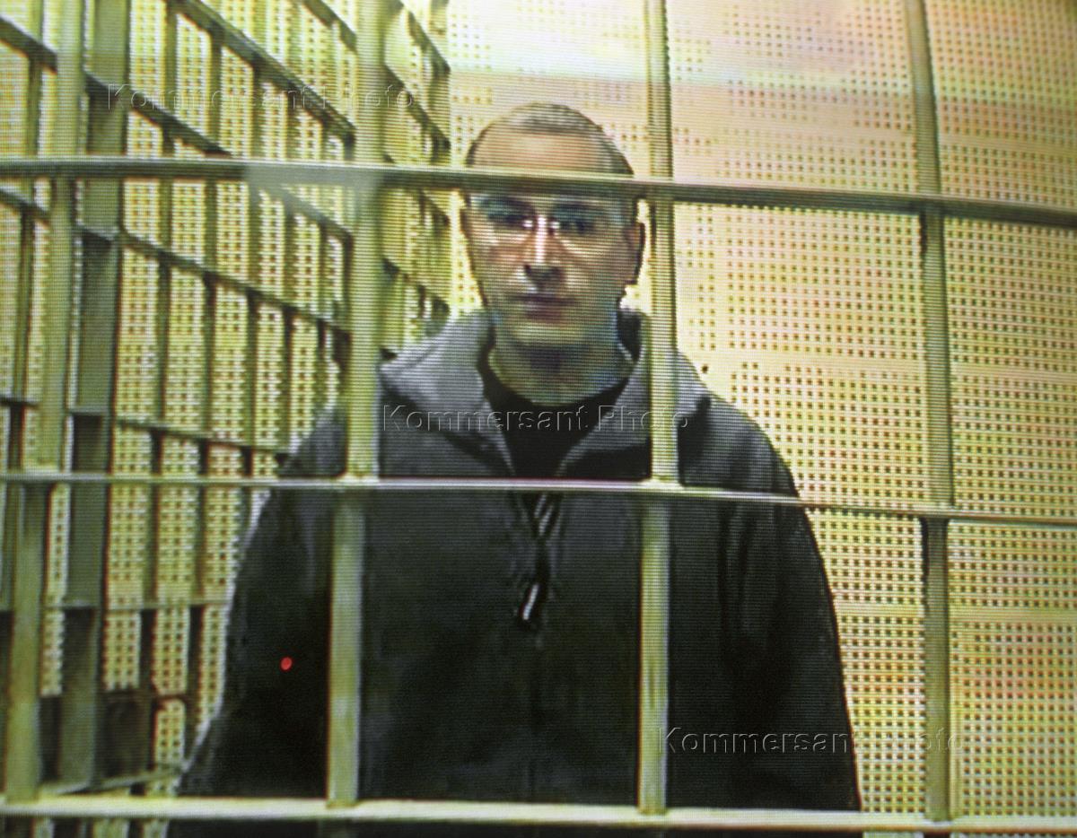Russian oil tycoon, major shareholder of Yukos oil company Mikhail Khodorkovsky is displayed on television screen during Moscow City Court hearings of his appeal filed to protest against extension of his preliminary confinement. Mr Khodorkovsky is accused of fraud and tax evasion.