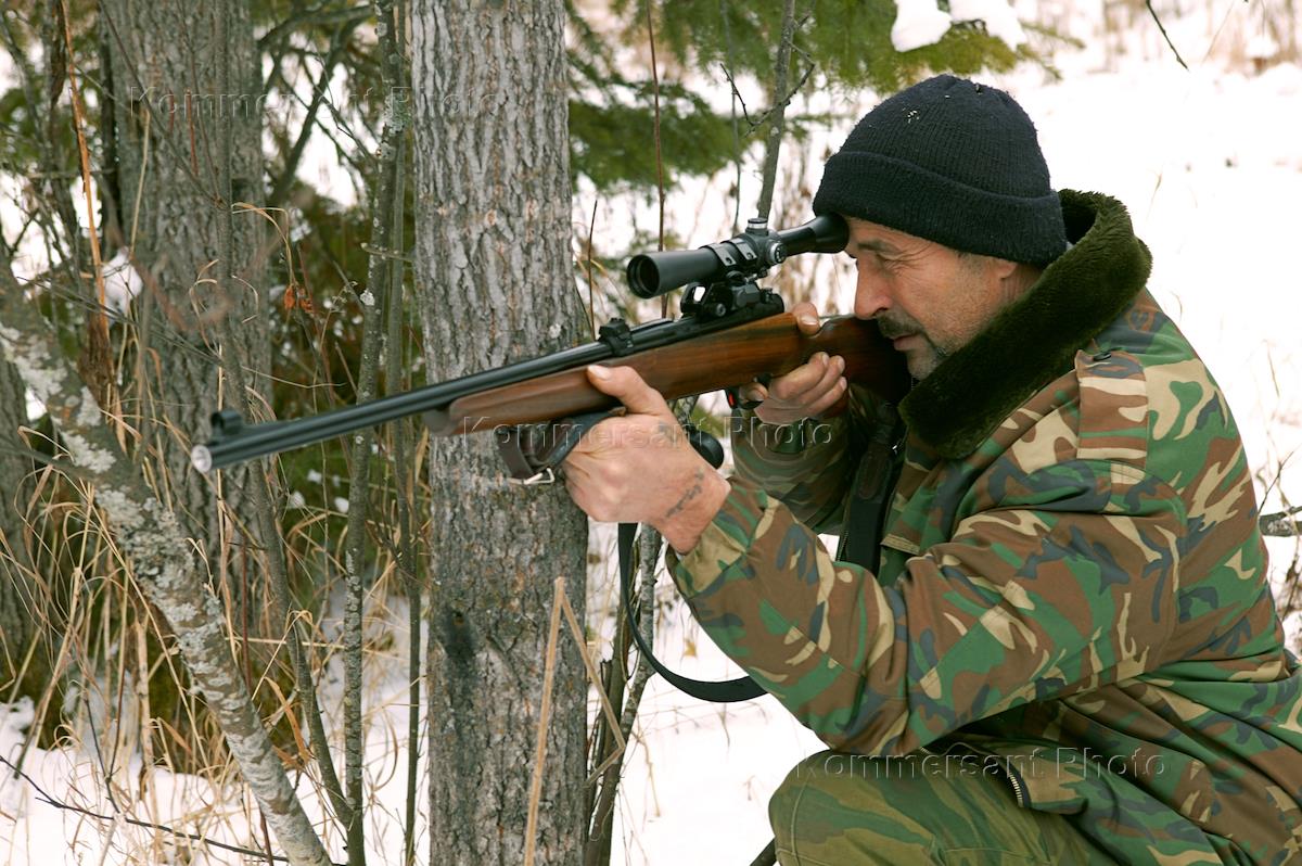 Hunting for a fox in the winter in Kareliya. The hunter with а bag.