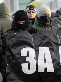 Митингующий националист в маске у плаката с буквами "За" на митинге "За честные выборы!".