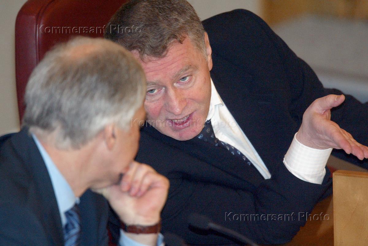 Председатель Государственной Думы России Борис Грызлов (слева) и его заместитель, лидер Либерально-демократической партии России (ЛДПР) Владимир Жириновский (справа) на пленарном думском заседании.