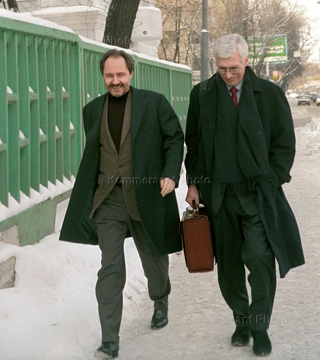 Бывший глава компании "ЮКОС-Москва" Василий Шахновский (слева) после судебного процесса в Мещанском межмуниципальном суде. Мещанский суд столицы приступил к прениям сторон на процессе по делу Василия Шахновского.