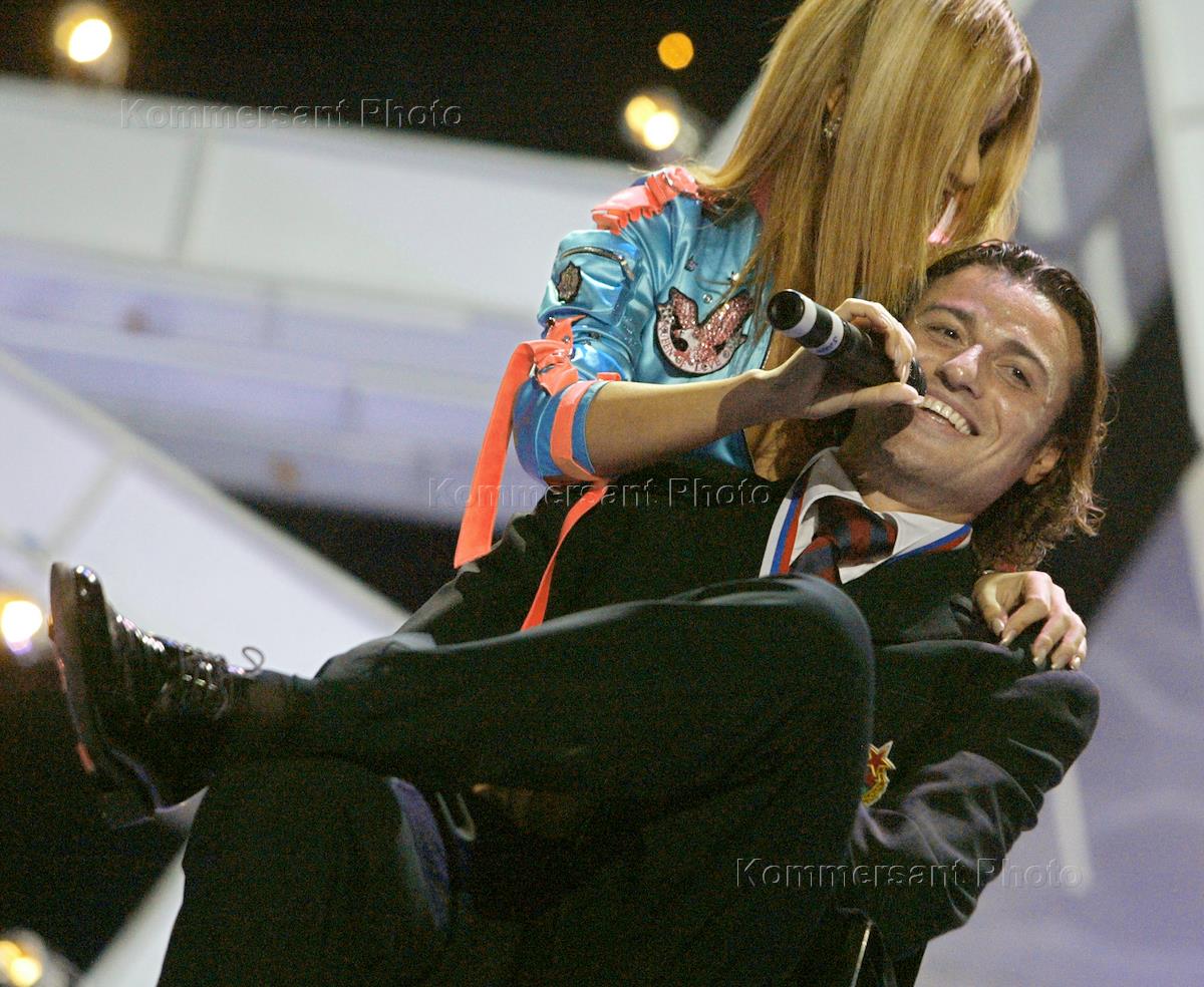 Player of CSKA football team Rolan Gusev and pop-diva Olga Orlova take part in the ceremony of awarding CSKA players with the Russian Cup golden medals. The event took place in the CSKA Sports Complex.