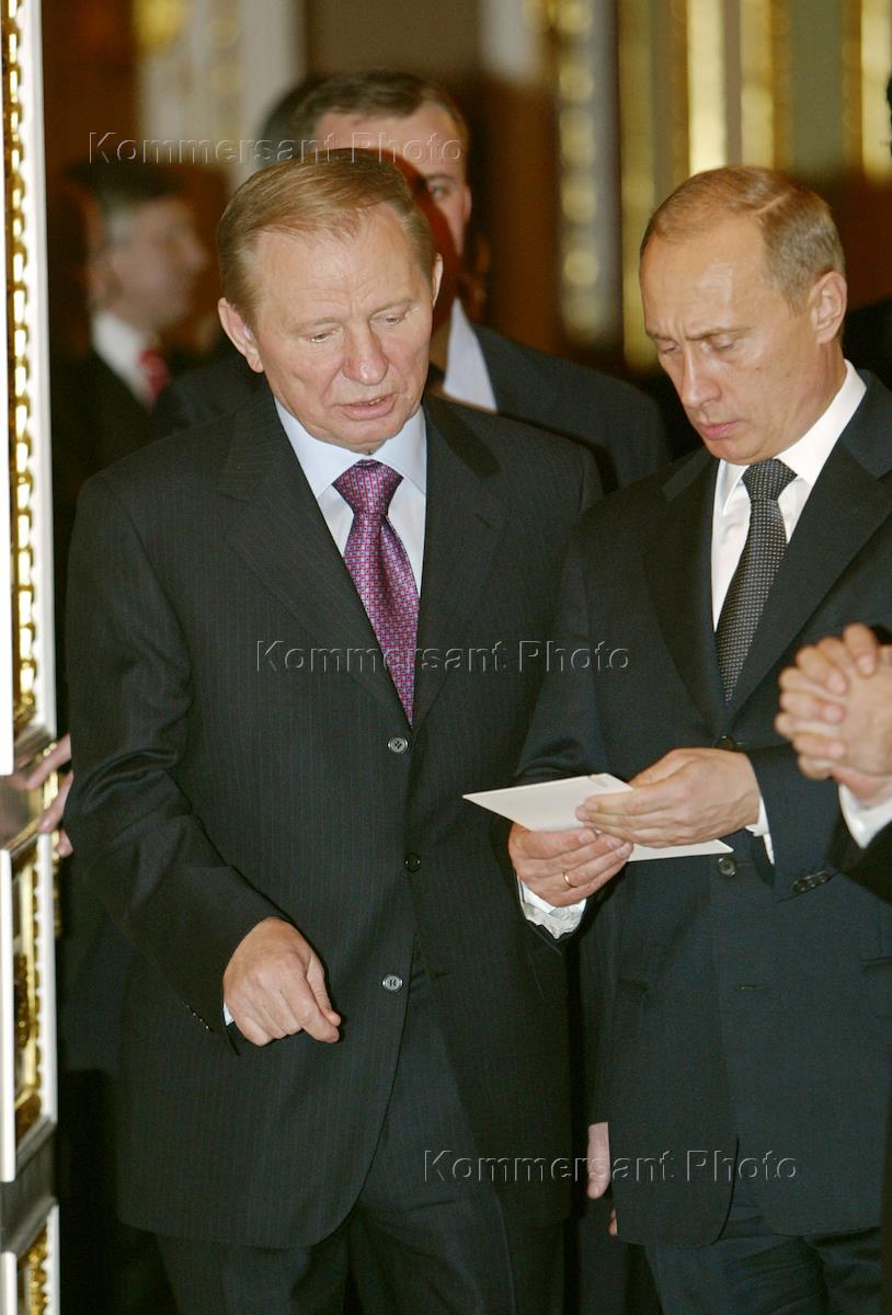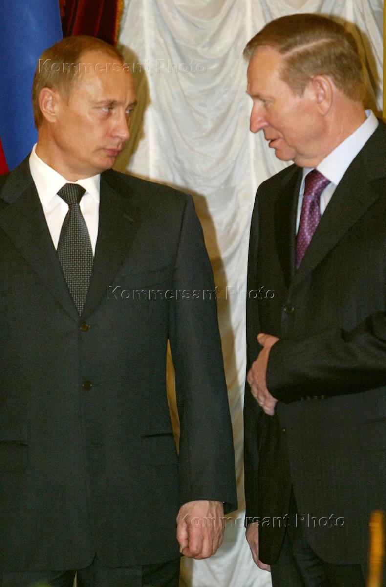Presidents Leonid Kuchma of Ukraine (left) and Vladimir Putin of Russia (right) talk during the latter's official visit to Ukraine.