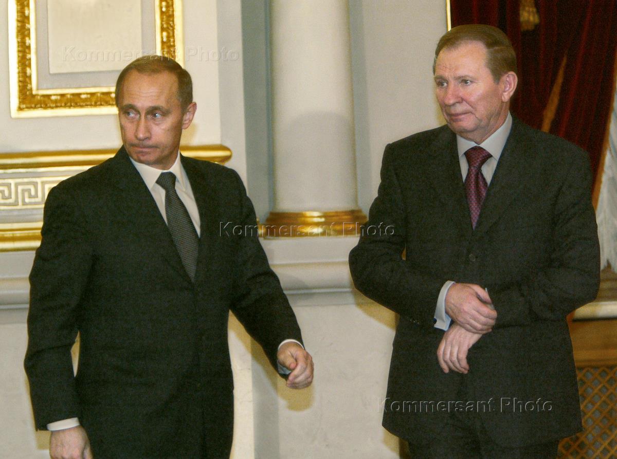 Presidents Leonid Kuchma of Ukraine (left) and Vladimir Putin of Russia (right) talk during the latter's official visit to Ukraine.
