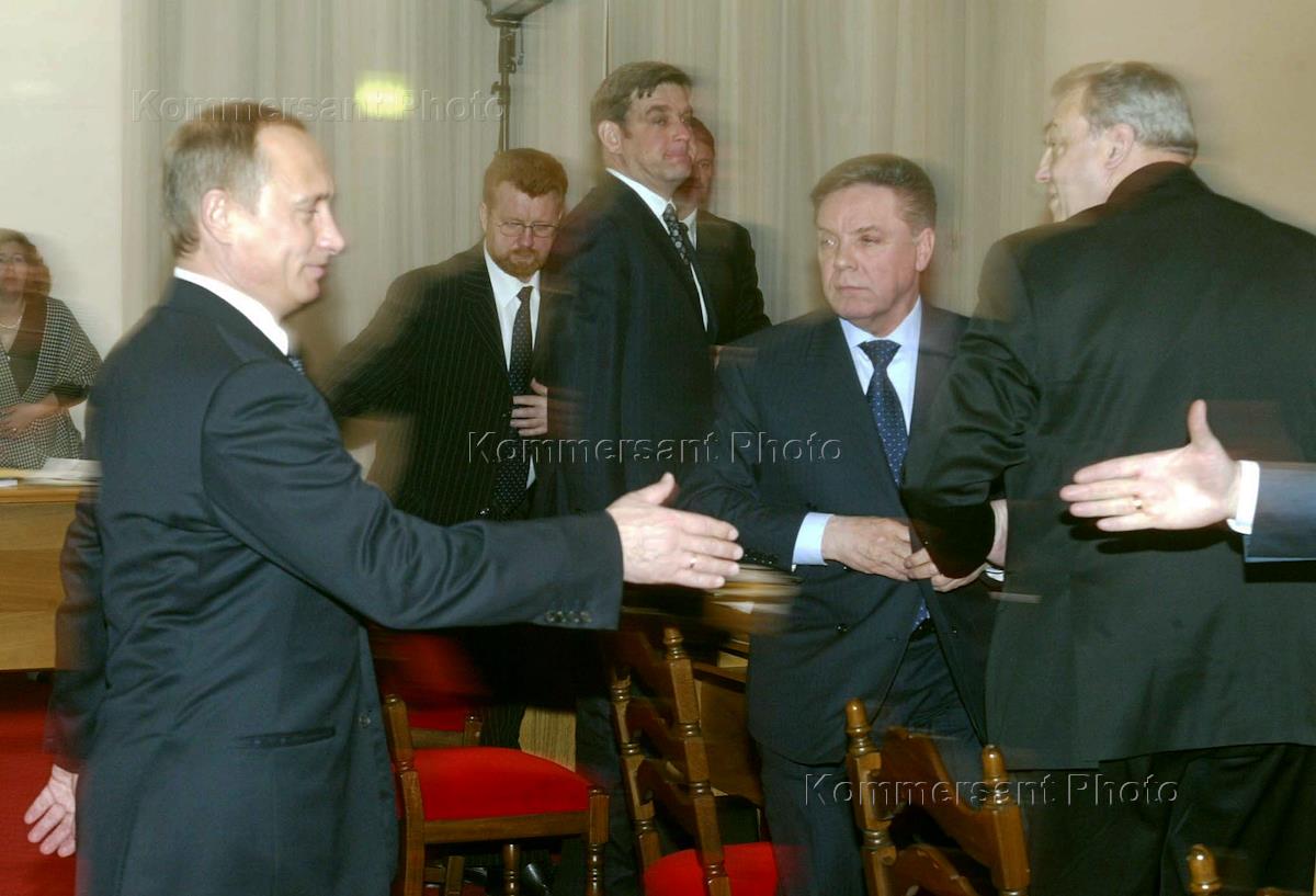 Russian President Vladimir Putin (left) and Moscow Oblast Governor Boris Gromov (second from the right) take part in a meeing of federal and regional officials held in St.Petersburg during the celebration of the 60th anniversary of the end of the WW2 Leningrad Siege.