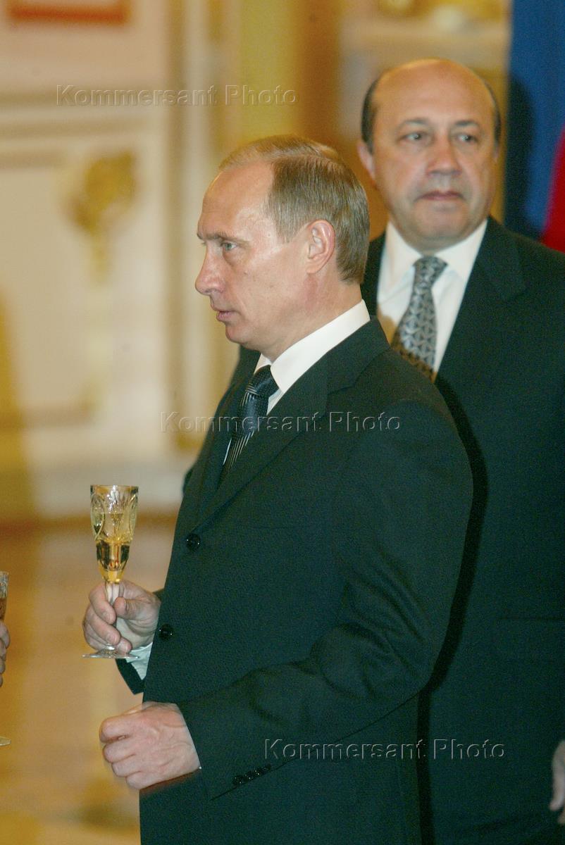 Президент России Владимир Путин (справа) и министр иностранных дел России Игорь Иванов (слева) во время торжественной церемонии вручения верительных грамот послам иностранных государств.