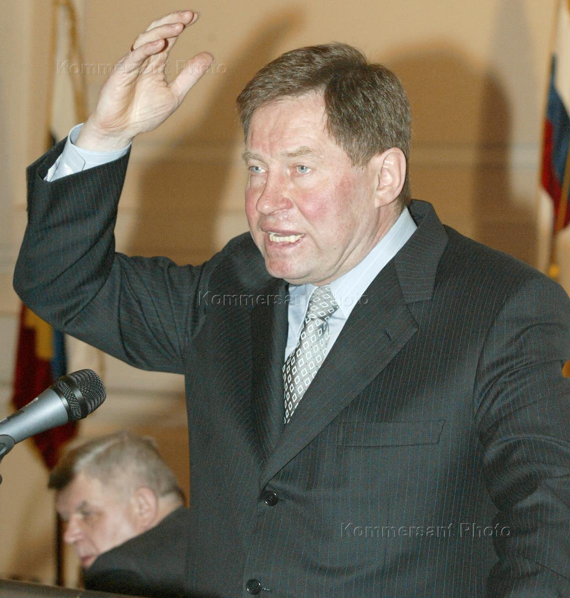 Russian presidential representative (polpred) for the Central Federal District Georgy Poltavchenko (left) and Railway Minister Vadim Morozov (right) arrive at the extended meeting of the Railway Ministry College headlined 'Railway Ministry Results in 2003 and the State Railway Policies in 2004'. The meeting was held in the Moscow Railway University.