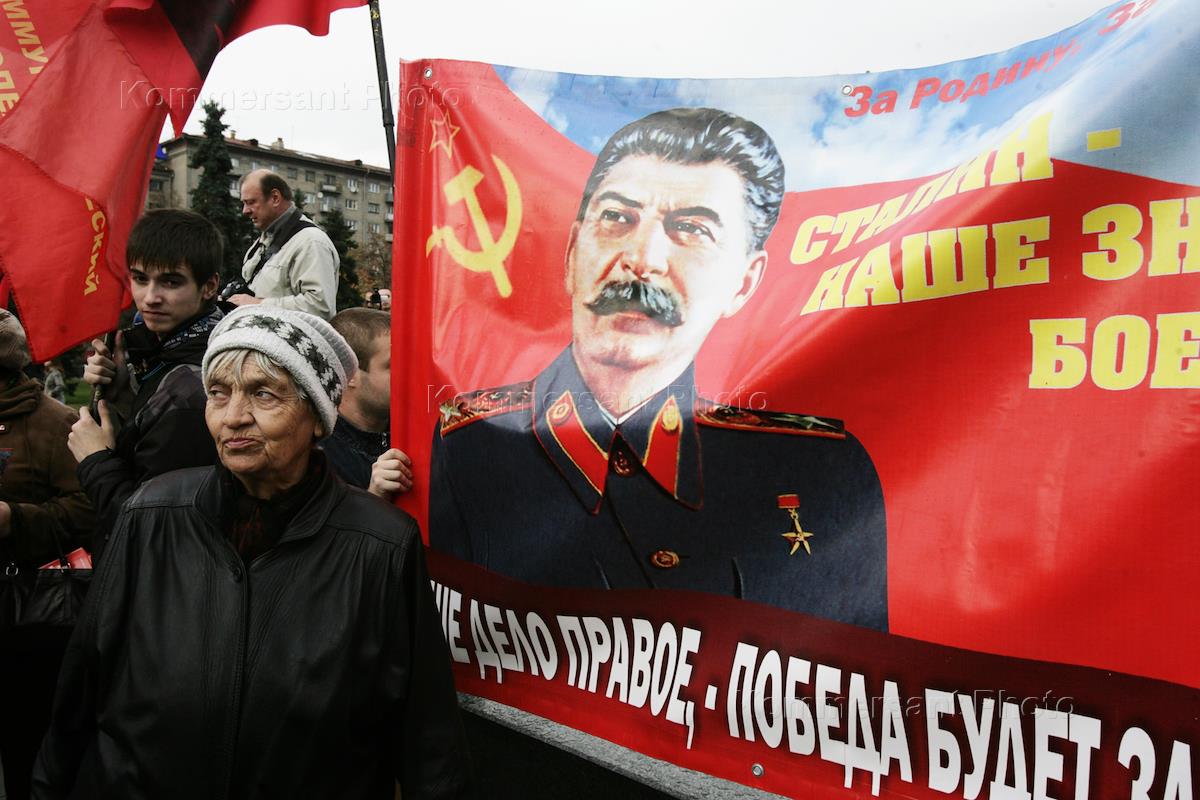 Встреча депутатов-коммунистов со своими избирателями на площади Ленина. Пожилая женщина рядом с плакатом Иосифу Сталину.