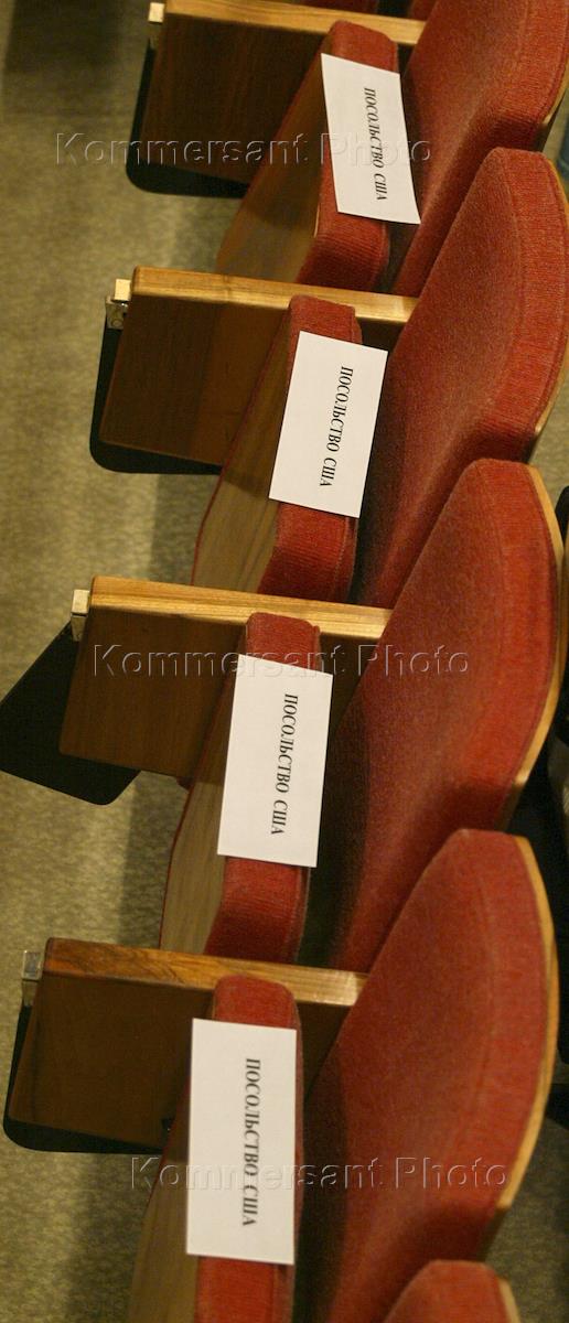 Empty seats, reserved for the US Embassy representatives, in the smaller conference hall of the Russian President's administration complex, before the All-Russian NGOs conference on fighting human traffiking.
