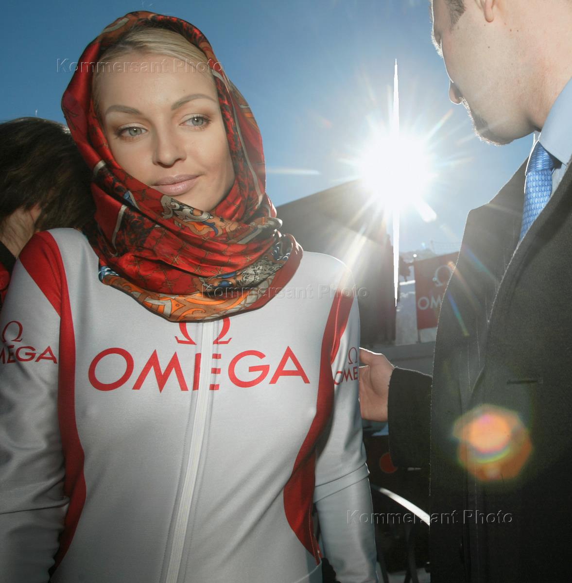 Russian ballet dancer Anastasia Volochkova (right) takes part in the bobsleigh world championship sponsored by Omega company.