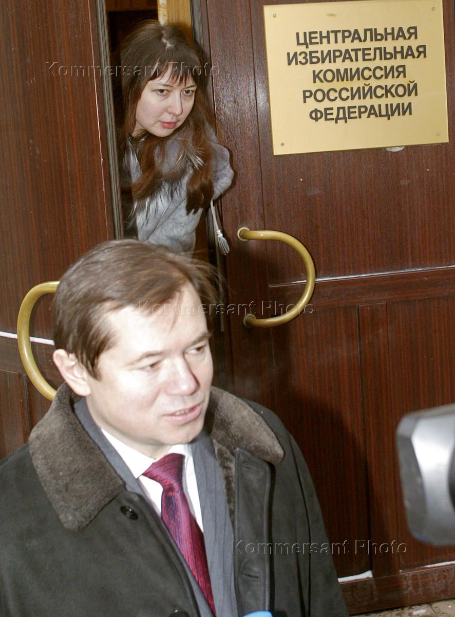 Co-chairman of the Rodina ('Motherland') political movement Sergey Glazyev (centre) leaves the Central Electoral Commission headquarters after he has been registered as a presidential candidate.