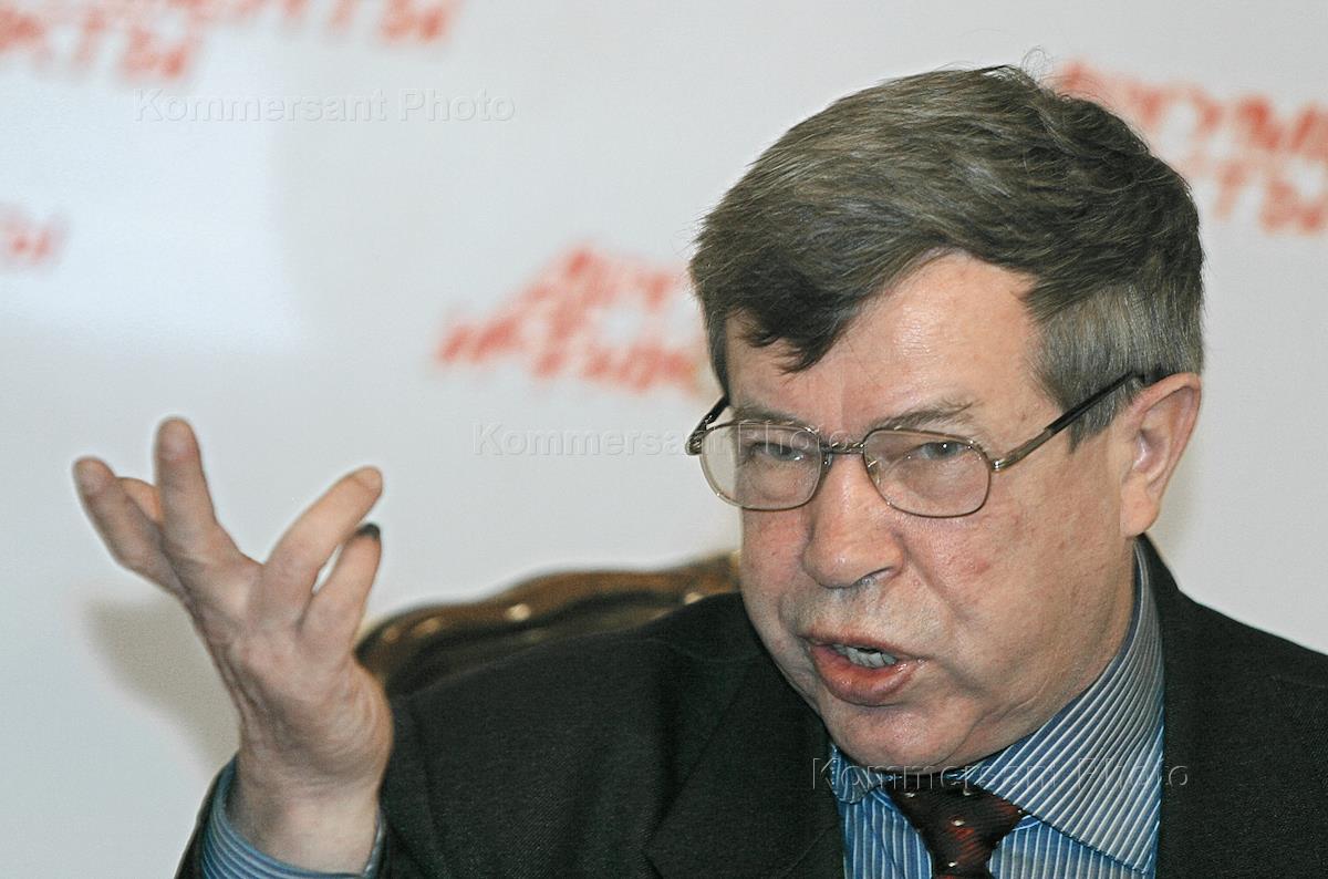 Leader of the ultra-left Trudovaya Rossiya ('Labouring Russia') movement Victor Anpilov is interviewed at the news conference headlined 'Presidential Election and Fascist Threat in Russia'. The news conference was held in the Argumenty-i-Fakty newspaper press-centre.