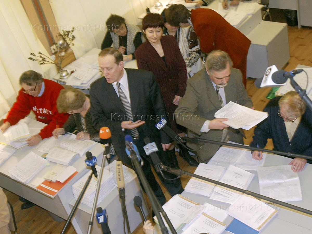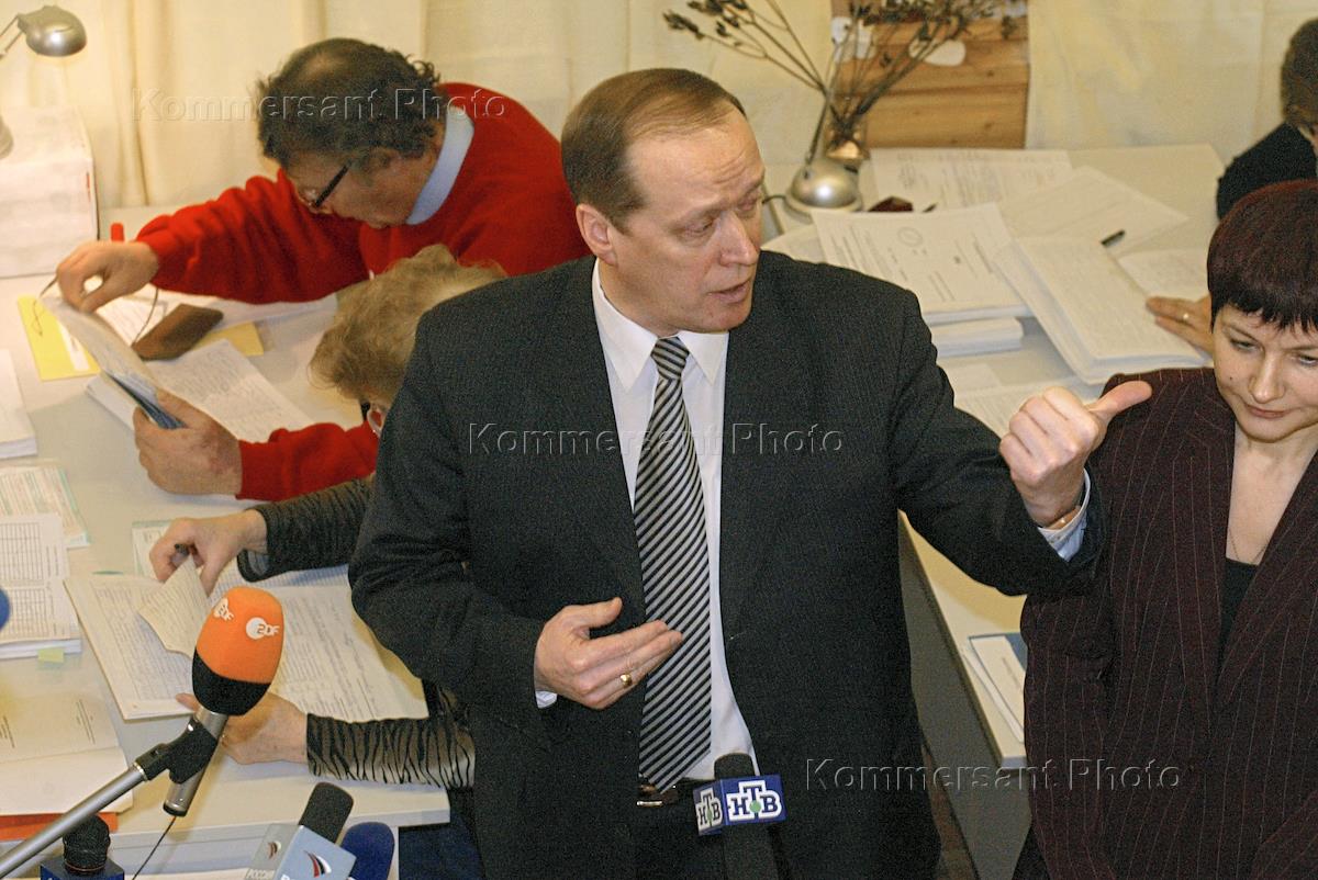 Chairman of the Russian Central Electoral Commission (CIK) Alexander Veshnyakov (centre) is interviewed while the CIK employees check the electors' signatures submitted by candidates to back up their nomination for the presidential election.