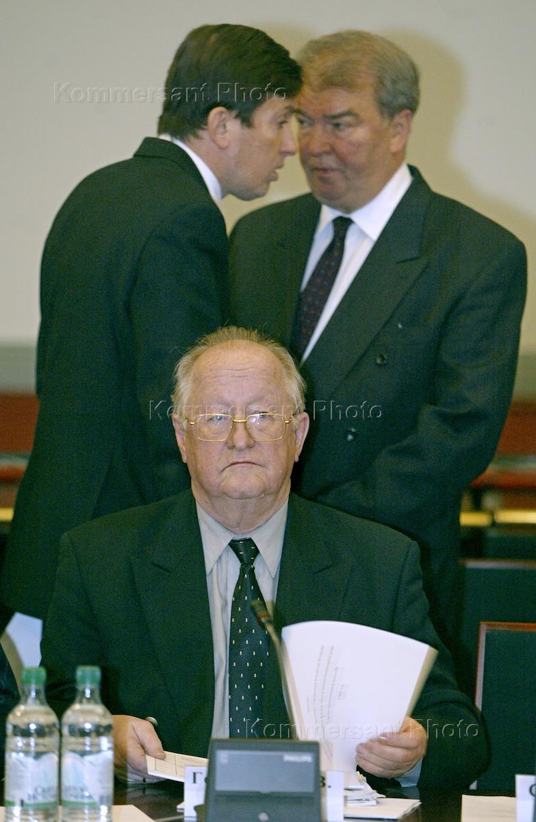 Президент Торгово-промышленной палаты (ТПП) России Евгений Примаков (слева), депутат от избирательного объединения Родина (народно-патриотический союз) Виктор Геращенко (в центре) и председатель Госстроя России Николай Кошман (справа) на заседании попечительского совета благотворительного фонда (ТПП) России.