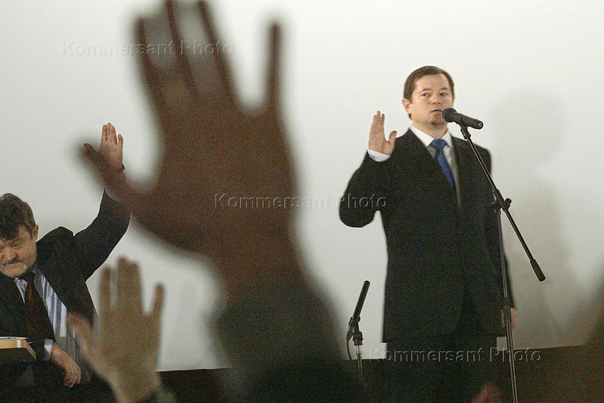 Co-chairman of the Rodina ('Motherland') political movement Sergey Glazyev addresses a congress of the Rodina supporters. The congress was held in the Rodina Movie Theatre.