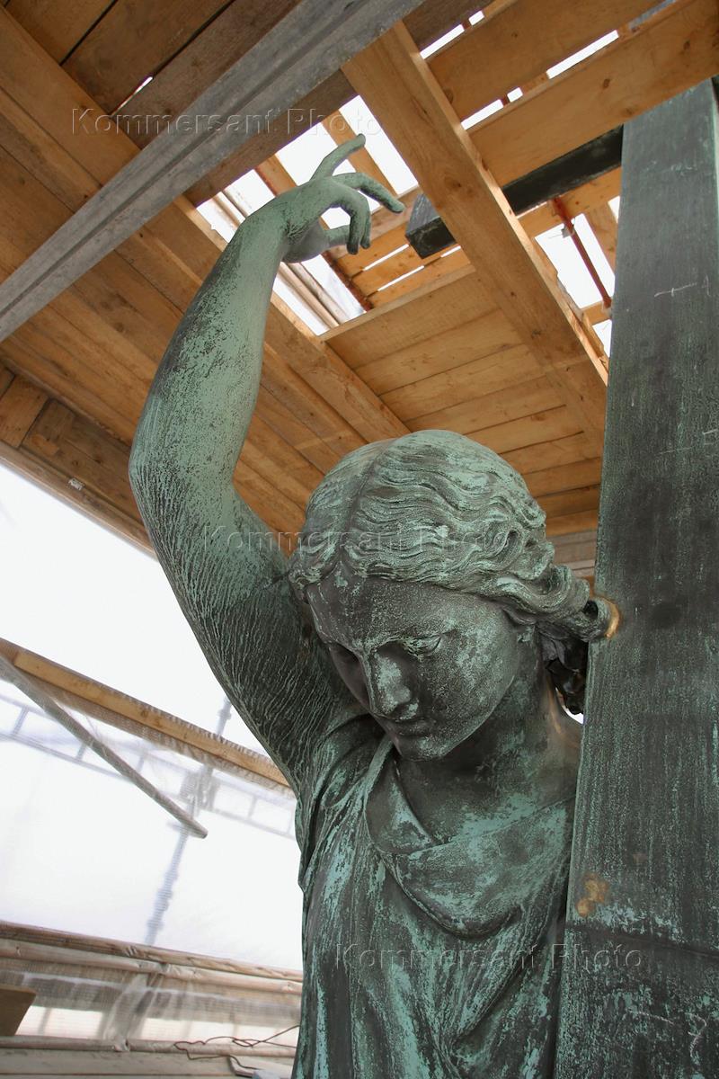 Реконструкция Санкт-Петербурга к трехсотлетнему юбилею. Ангел на Александрийской колонне во время реставрации.
