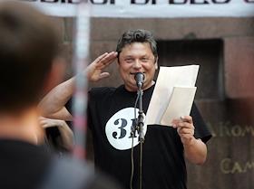 Митинг "Стратегии 31" на площади Свободы. Правозащитник Станислав Дмитриевский во время выступления на митинге.