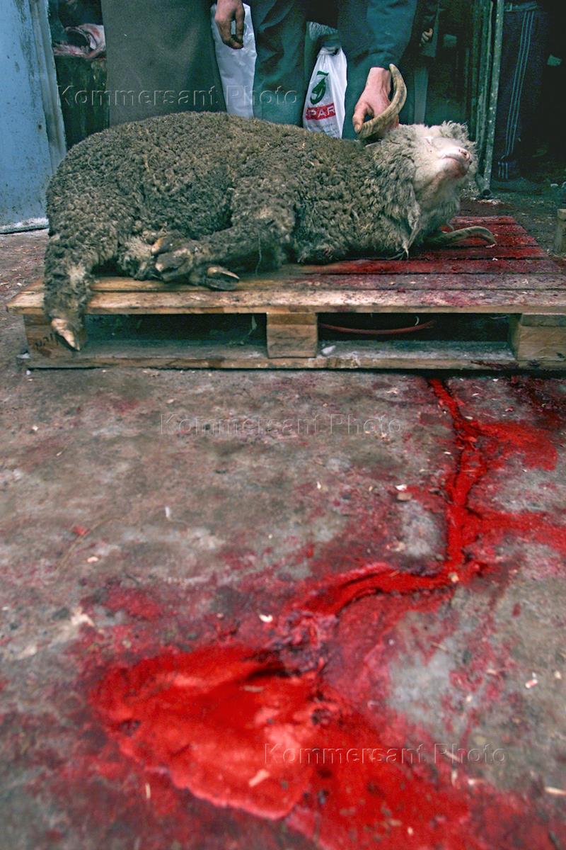 A bleeding sheep sacrificed by the Moscow muslims on the Islamic holiday of Kurban-Bayram.